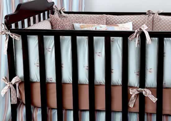 Sky Gustave/Honey Gilles bumper, piped in Honey Gilles Honey 300 tc sateen fitted crib sheet. Fog Chloe tailored 15" drop crib skirt. Smocked Honey Gilles pillow. Patch 12x16 pillow