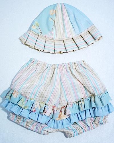 THESE COORDINATED SETS ARE TOO PRECIOUS TO RESIST, BUT WE DO SELL THEM SEPARATELY IF YOU WANT ONLY A TOP OR A BOTTOM. THE PIECES ARE DESIGNED BY COLOR GROUP SO THE FABRICS WILL VARY SLIGHTLY. BESIDES, NO GIRL WANTS TO LOOK LIKE THE OTHER GIRLS ON THE PLAYGROUND! THE HAT HAS TIES TO KEEP IT SECURE AND THE BLOOMER HAS RUFFLES ON THE BUTT, OF COURSE!